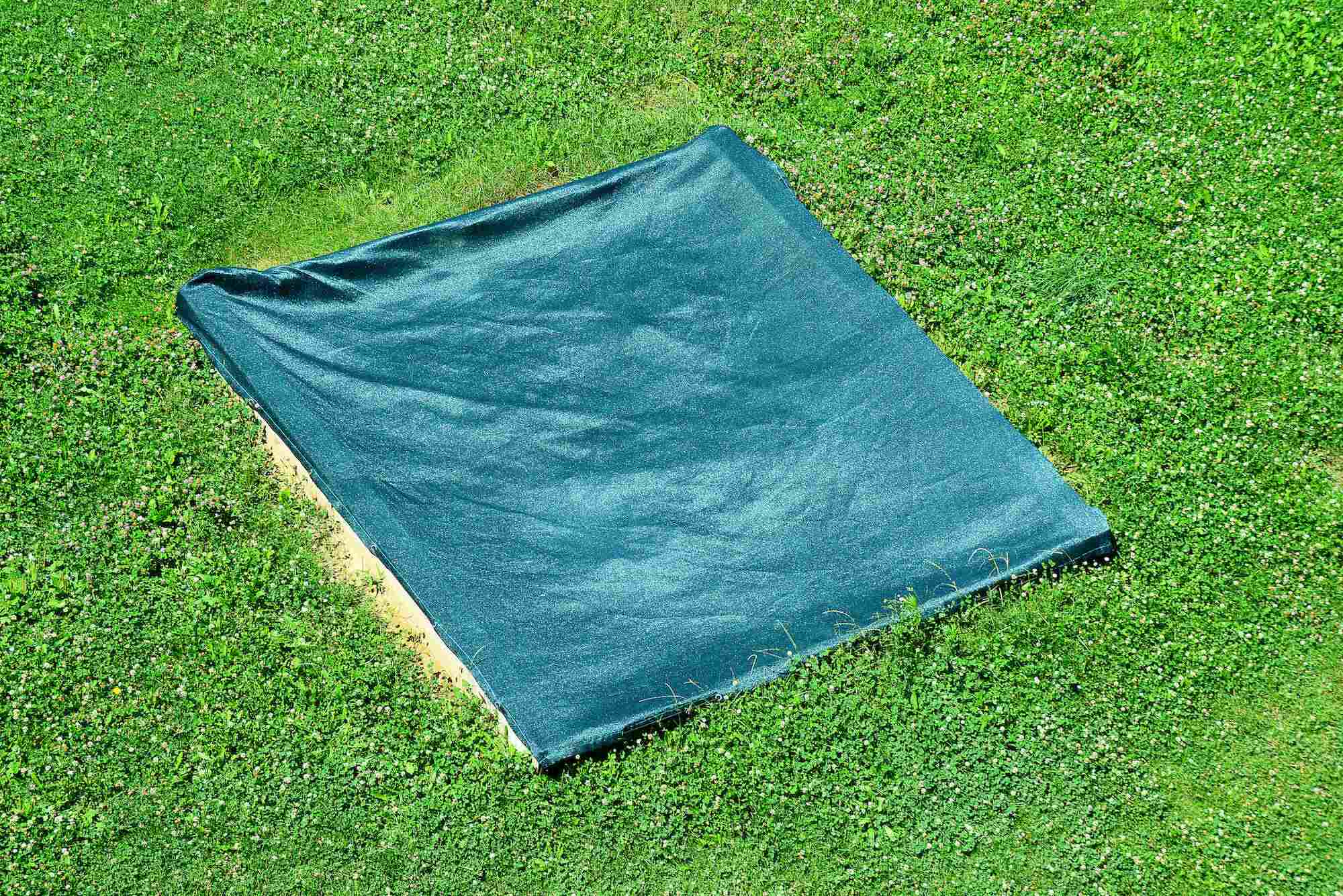 Die luftdurchlässige Abdeckplane, die beispielsweise mithilfe von Gummibändern um den Sandkasten gespannt wird, kann blitzschnell angebracht werden: Einmal an die Größe des gewünschten Bereichs angepasst, ist die Plane jederzeit einsatzbereit.